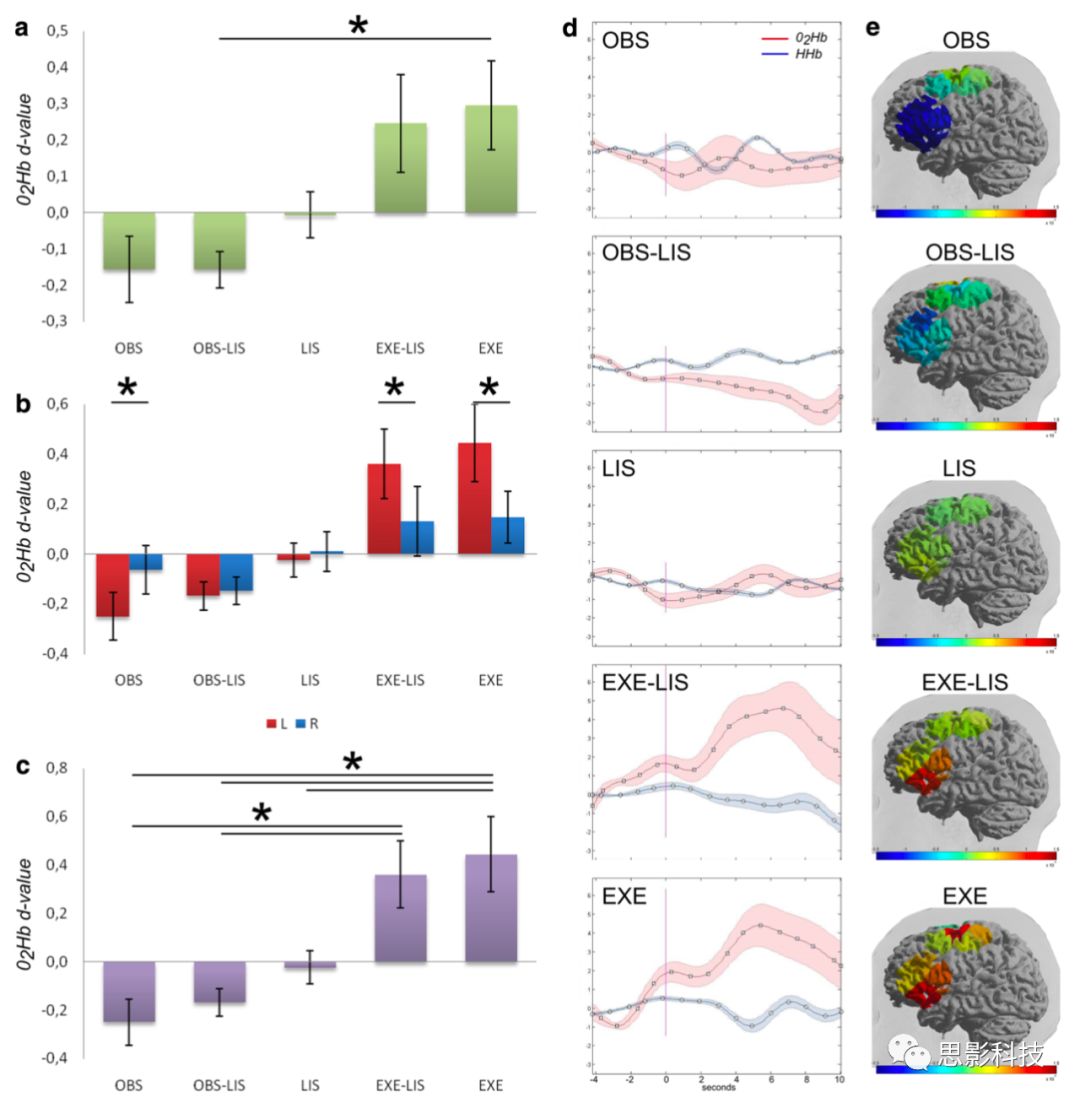 方差分析結(jié)果表明,條件的主效應(yīng)檢驗(yàn)顯著(p = 0.008)。條件與偏側(cè)的交互作用顯著(p =0.001)。事后檢驗(yàn)發(fā)現(xiàn),OBS-LIS 與EXE條件存在顯著性差異(見圖3a),在EXE條件下的腦區(qū)激活更大相比于在OBS條件下。此外,通過分析條件與偏側(cè)化的交互作用,發(fā)現(xiàn)在EXE和EXE-LIS條件下的左側(cè)大腦激活更大相比于右側(cè)大腦(均p <0.05)。但是在OBS活動(dòng)中,右側(cè)大腦的激活要強(qiáng)于左側(cè)大腦見圖3b)。此外,簡(jiǎn)單效應(yīng)檢驗(yàn)發(fā)現(xiàn),相比于與OBS,OBS–LIS和LIS條件,左半球的激活程度在EXE條件下最高(所有p <0.05)。相對(duì)于OBS和OBS–LIS條件,EXE–LIS條件也導(dǎo)致更大的左側(cè)皮層激活(p均<0.05;圖3c-e)。