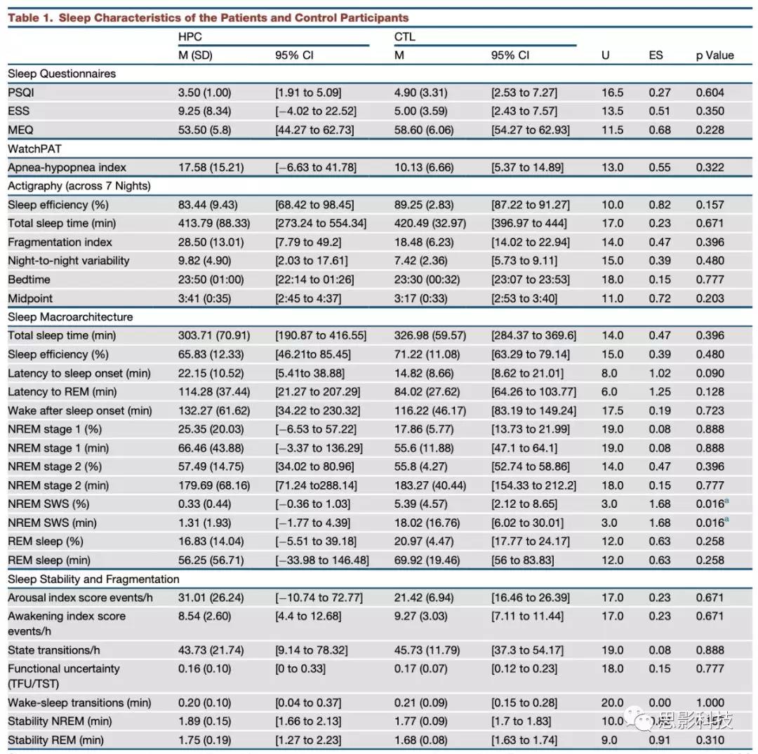 睡眠質(zhì)量(Table1):患者和對(duì)照組在一般質(zhì)量和睡眠模式的問卷測量、白天嗜睡程度以及睡眠類型方面均無顯著差異。兩組在客觀衡量睡眠質(zhì)量方面也無顯著差異。同樣的結(jié)果包括:WatchPAT的呼吸障礙指標(biāo),以及整體睡眠時(shí)間、睡眠效率(在床上睡覺花費(fèi)的時(shí)間百分比,兩組均大于80%)、睡眠片段化(由于持續(xù)的身體運(yùn)動(dòng)被認(rèn)為是難以入睡的睡眠百分比)的Actiwatch測量。這些結(jié)果表明,睡眠質(zhì)量的一般特征不太可能由海馬調(diào)節(jié)。