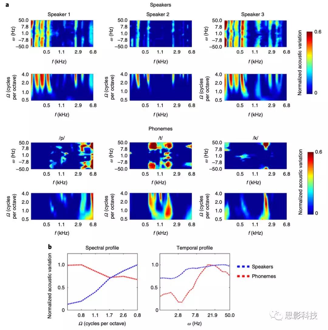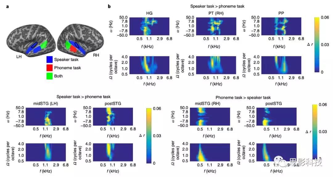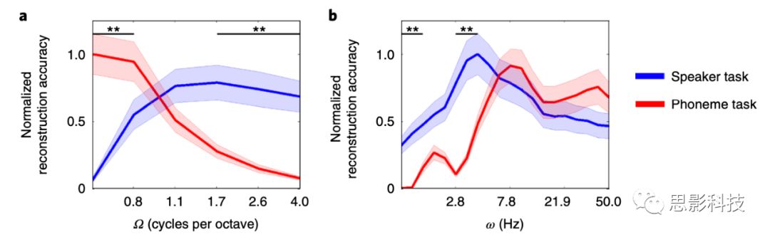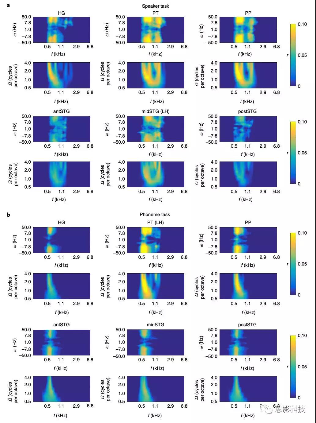 b,在音素任務(wù)期間,發(fā)現(xiàn)中心頻率在0.4 kHz和1.0 kHz之間的快速時(shí)間調(diào)制(上下> 10> Hz)具有峰值重建精度。所有相關(guān)性均經(jīng)過(guò)統(tǒng)計(jì)學(xué)驗(yàn)證。