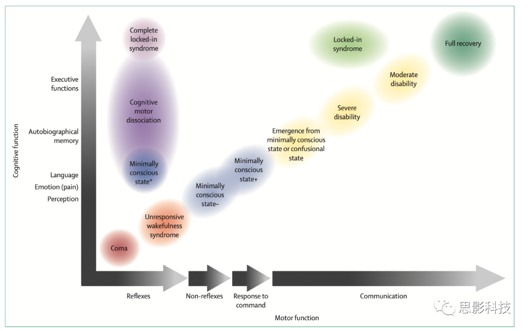 重度腦損傷后的不同診斷可根據(jù)二維坐標(biāo)軸上認(rèn)知功能及運(yùn)動功能程度進(jìn)行比對。紅圈代表僅有反射性運(yùn)動的無意識患者(昏迷及無反應(yīng)覺醒綜合癥)?;@圈代表最低意識狀態(tài)患者(最低意識狀態(tài)+或-根據(jù)所保留的語言功能)。當(dāng)存在功能性交流(黃圈),患者從最低意識狀態(tài)喚醒,并在完全康復(fù)前(深綠色圓圈)可能發(fā)展為混亂狀態(tài)或中重度殘疾。運(yùn)動與認(rèn)知功能的分離存在于閉鎖綜合征(淺綠色圓圈),認(rèn)知運(yùn)動分離(深紫色),最低意識狀態(tài)*(深藍(lán)色)。在少數(shù)病例,完全性閉鎖綜合征(淺紫色)的診斷可通過神經(jīng)影像檢查。由黑至白的漸變代表行為由喪失至恢復(fù)的進(jìn)展過程。