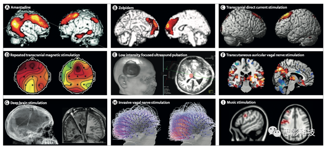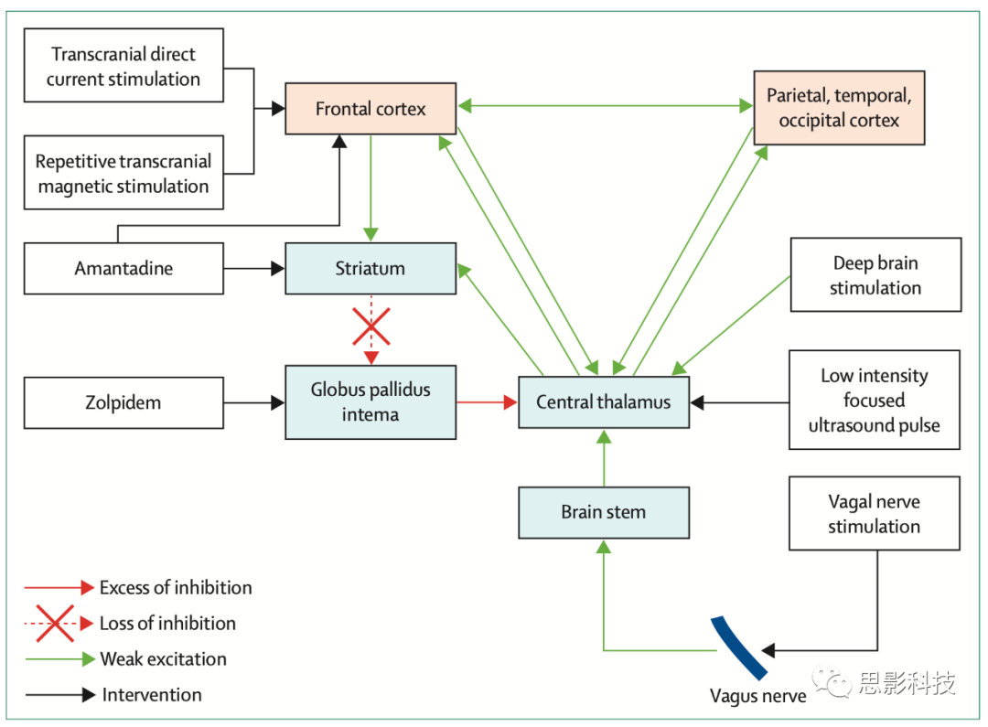 所刺激部位的前額葉部分保留是對經(jīng)顱直流電刺激有響應(yīng)的必要條件,初級運(yùn)動皮層經(jīng)顱磁刺激治療似乎誘發(fā)整個皮層震蕩的增加。對金剛烷胺的臨床響應(yīng)與額頂腦代謝增加相關(guān)。吡唑坦通過直接興奮及間接抑制蒼白球誘發(fā)額葉皮層與紋狀體的廣泛性興奮。深部腦刺激直接作用于中央丘腦,刺激丘腦皮層連接,低強(qiáng)度聚焦超聲脈沖刺激以非侵入性的方式刺激丘腦。侵入與非侵入性迷走神經(jīng)刺激直接刺激迷走神經(jīng)。