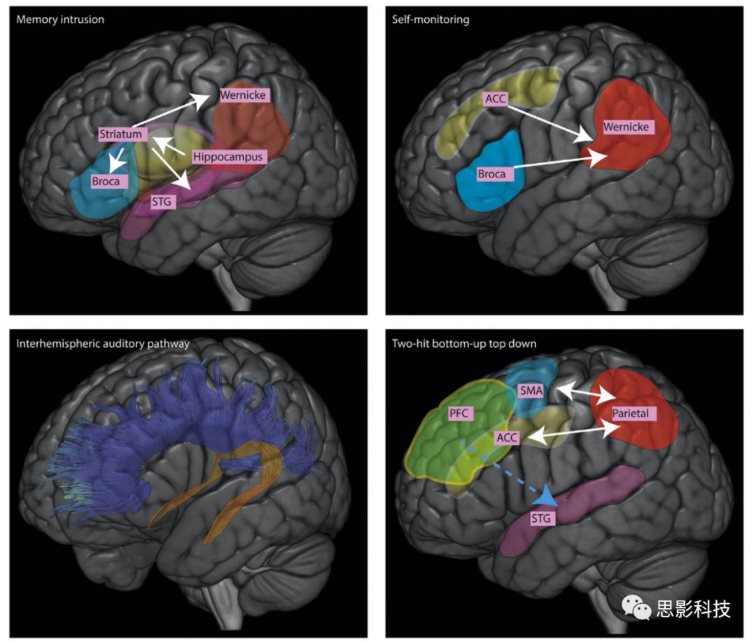 但是,一個(gè)重要的共識(shí)是AVH與語言、聽覺和記憶/邊緣網(wǎng)絡(luò)的交互障礙相關(guān),這些網(wǎng)絡(luò)不是相互獨(dú)立的,而是相互聯(lián)系的。在解剖學(xué)研究中發(fā)現(xiàn),其中一些區(qū)域具有多重網(wǎng)絡(luò)功能。最好的例子是顳上區(qū),次級(jí)聽覺皮層與韋尼克區(qū)重疊。