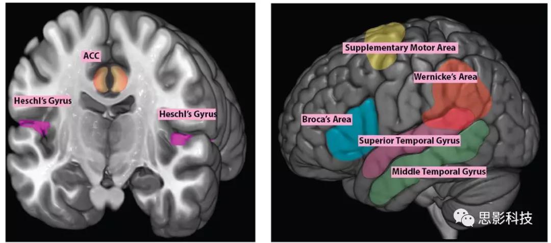 聲音首先在初級(jí)聽覺皮層(PAC)被感知和處理,PAC位于顳上回(STG)的上平面,稱為顳上回(Heschl gyrus)(圖2),從那里,聲音和聲音被傳入到次級(jí)聽覺皮層,包括STG(顳上回)、MTG(顳中回)區(qū)域,然后通過丘腦發(fā)送到更高級(jí)的感知處理區(qū)域,如Wernick區(qū)域和其他語言區(qū)域。