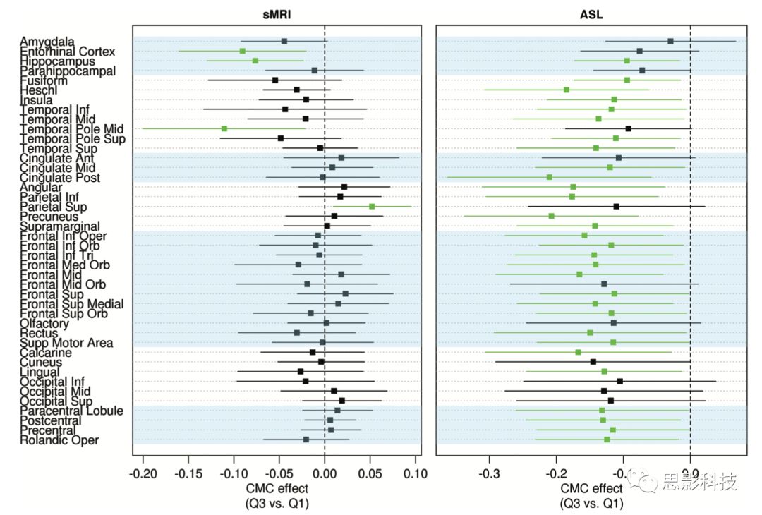 CMC(心血管和代謝狀況)與腦影像指標的回歸系數(shù)以及95%置信區(qū)間如下圖一、圖二、圖三。圖一左側反映CMC與皮層厚度的關系,提示血管健康狀況越差,顳葉內(nèi)側皮層厚度(內(nèi)嗅皮層以及海馬)與顳中極皮層厚度越薄(P<0.05);同時上頂葉皮層厚度與CMC呈正相關,但是效應低于顳葉皮層。圖一右側反映CMC與腦灌注的關系,研究發(fā)現(xiàn)CMC升高情況下,大部分腦區(qū)灌注降低(除了枕葉區(qū)域)。