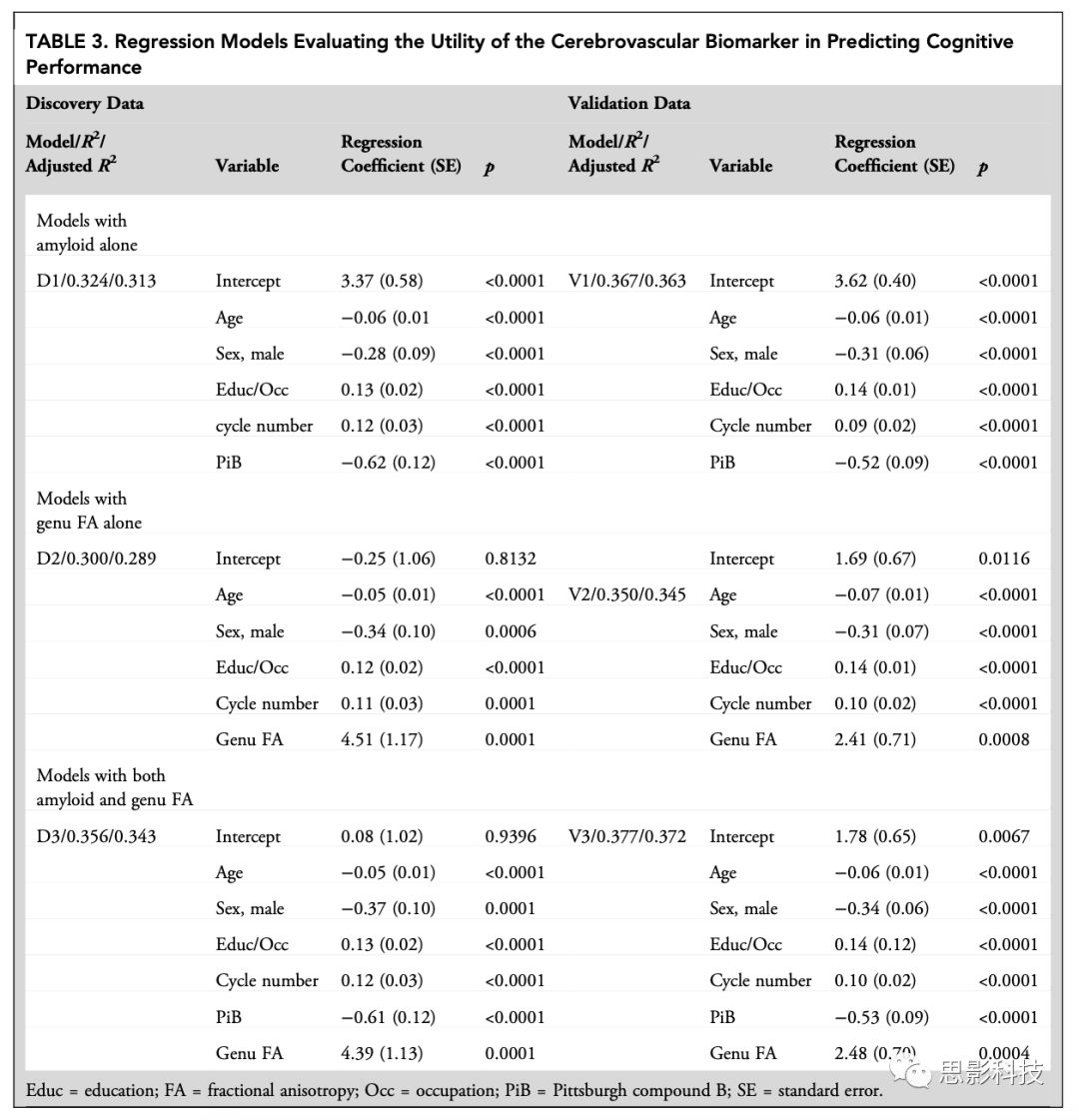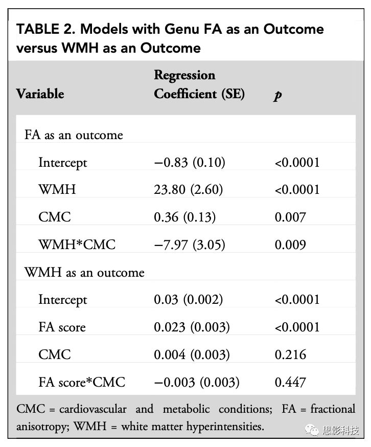 它也是唯一一個能夠通過Bonferroni校正的。在敏感性分析中,胼胝體膝部FA與WMH(白質(zhì)高信號)體積顯著相關(皮爾森相關系數(shù)0.629)。將胼胝體膝部FA作為因變量構建模型,CMC與WMH體積可解釋其變異性;將WMH體積作為因變量構建模型,只有胼胝體膝部FA可以解釋其變異性(見下表3)。作者提出假設,在腦血管病變并不明顯時,DTI FA比WMH測量更敏感。