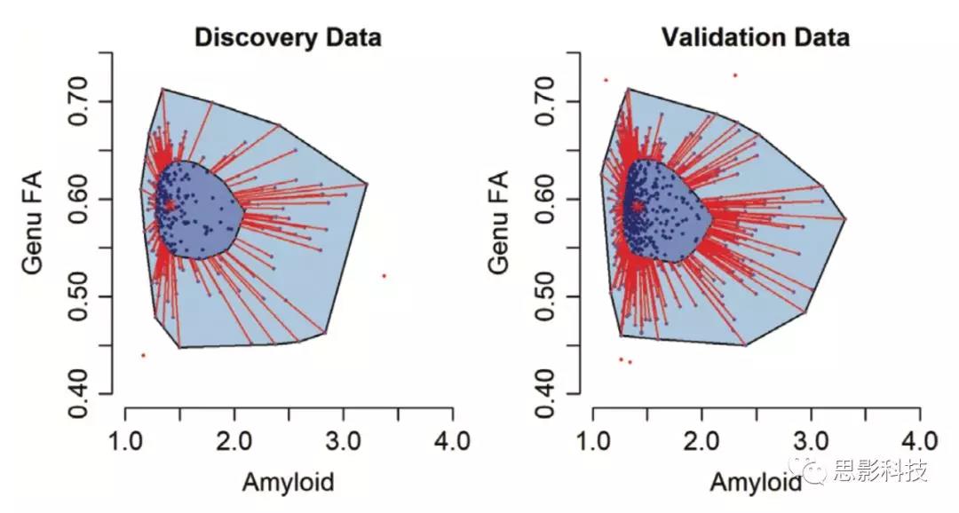 注:袋圖(bagplot)是一種用于可視化兩維或三維統(tǒng)計數(shù)據(jù)的穩(wěn)健統(tǒng)計方法,類似于一維箱形圖。bagplot是由Rousseuw等人在1999年引入的,它允許可視化數(shù)據(jù)集的位置、分布、偏態(tài)和離群值。