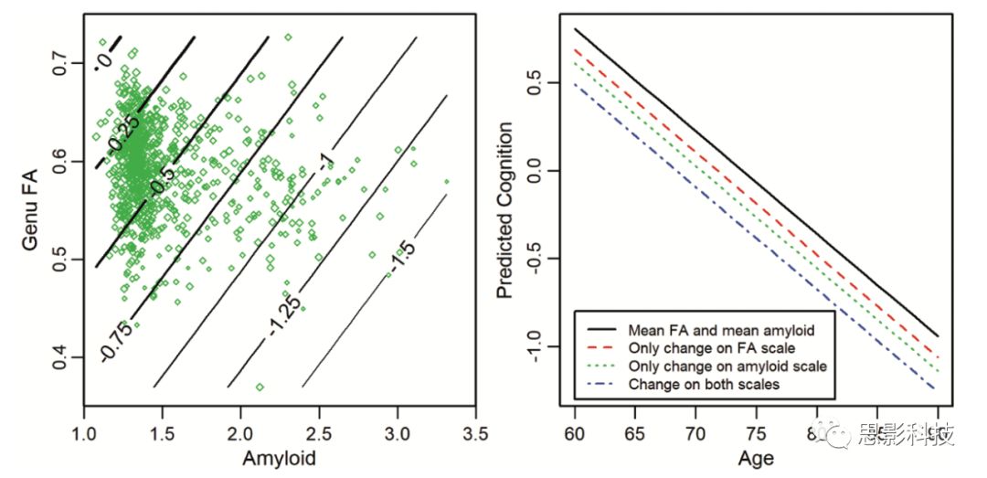 圖5:(左側)胼胝體膝部FA與Aβ預測認知等高線圖。(右側)年齡對認知的預測圖。