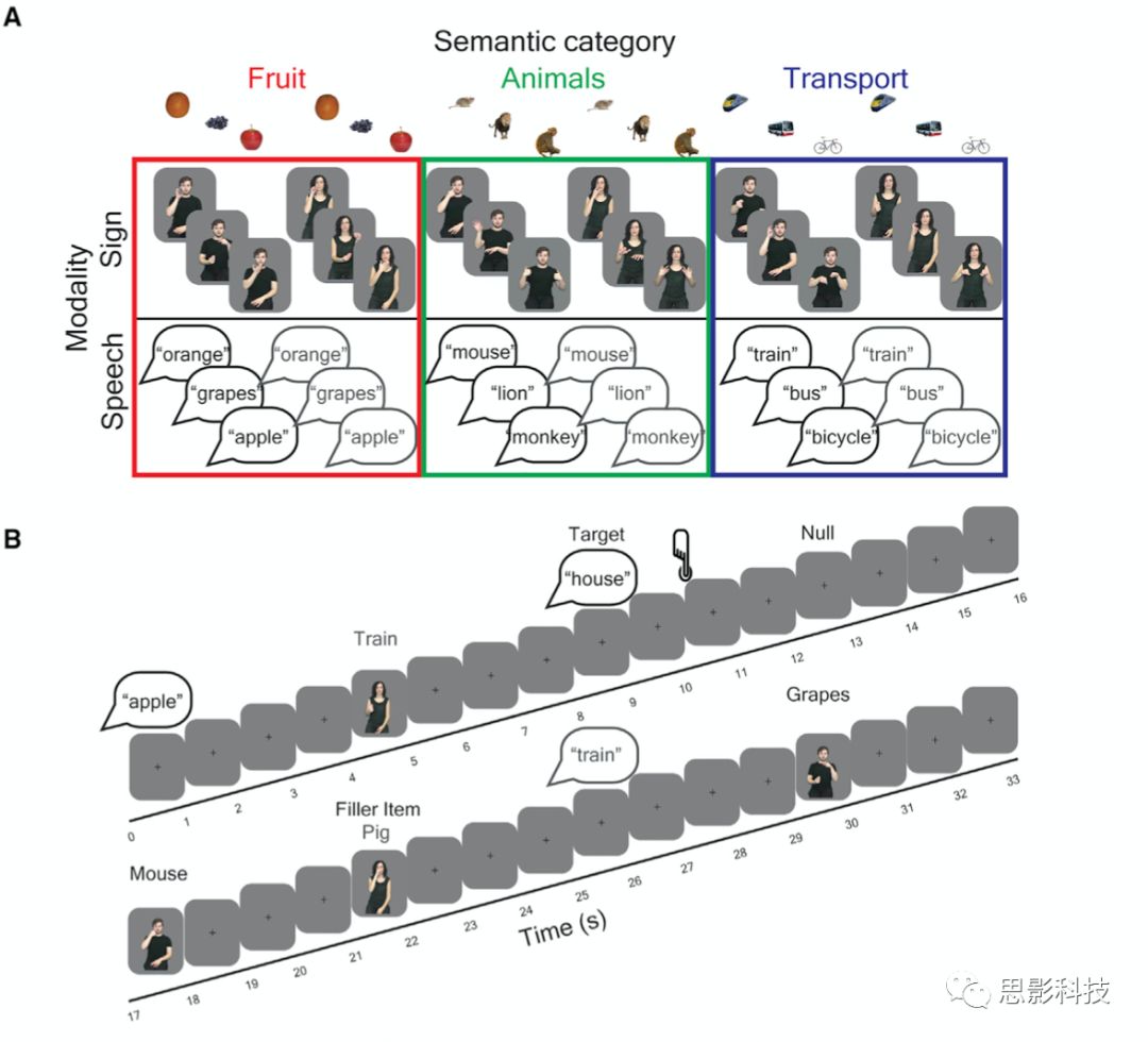 作者一共選擇了三種類別的刺激物:水果、動(dòng)物和交通工具,每種種類有三個(gè)概念物,水果類是:橘子、葡萄和蘋果,動(dòng)物類是:老鼠、獅子和猴子,交通工具是:火車、大巴和自行車(圖1A)。呈現(xiàn)類型分為兩種,一種為聽覺呈現(xiàn)(口語的聽覺通道),一種為手語視頻呈現(xiàn)(手語的視覺通道)。