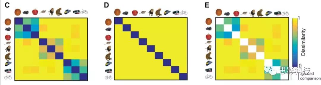 注:C圖模型是根據(jù)CSLB模型中的語義特征關(guān)系根據(jù)非參的Tau-a相關(guān)方法表征其關(guān)系的語義特征模型。D圖是一種基于項(xiàng)目的模型,它預(yù)測每個(gè)項(xiàng)目是唯一表示的,例如,一個(gè)蘋果與其他項(xiàng)目的差異比與它自己的差異更大,并且不能預(yù)測項(xiàng)目之間更廣泛的語義關(guān)聯(lián)。E圖是一種基于分類的模型,其中項(xiàng)目間的相似性由語義特征模型預(yù)測,而項(xiàng)目內(nèi)的相似性則不進(jìn)行測試。這個(gè)模型中的白色方塊表示被排除的比較。