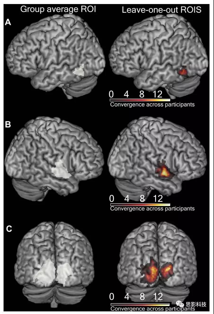 作者使用了search-light二階分析中得到的團(tuán)塊結(jié)果作為感興趣區(qū),這么做的主要原因是測試當(dāng)測試樣本大小受到特殊人群限制時(shí),可以利用有可靠結(jié)構(gòu)表征的ROI分析來降低由于全腦分析沒有可信的結(jié)構(gòu)表征而造成的虛假相關(guān)。