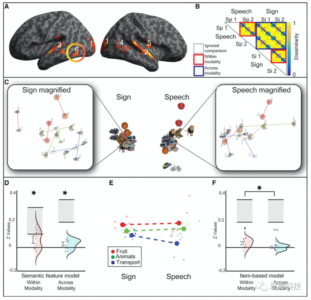 C-F是對B圖中cluster6的具體分析結(jié)果,因?yàn)檫@個(gè)區(qū)域是在RSA分析中發(fā)現(xiàn)可以和模態(tài)內(nèi)表征及模態(tài)間表征模型能夠擬合的區(qū)域,這個(gè)cluster位于左側(cè)顳下回后中部(-48,-62,-6)。其中,C圖是對這一區(qū)域根據(jù)MDS方法圖示化的模態(tài)內(nèi)的距離表征,左邊為手語模態(tài)內(nèi),右邊為口語模態(tài)內(nèi),放大的圖中的1和2代表的各自模態(tài)內(nèi)的不同的錄制者(即一個(gè)男的一個(gè)女的)。