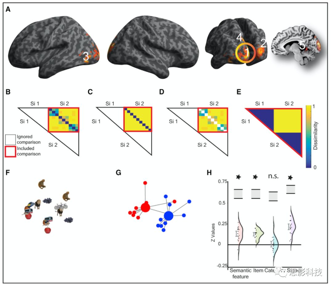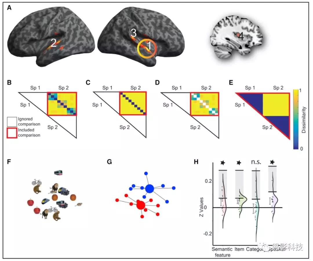 作者使用三種不同的方法建立了刺激材料的表征模型,首先根據(jù)CSLB準(zhǔn)則構(gòu)建了刺激材料的詞匯之間的表征模型(圖2C),以此來表示不同刺激之間的語義相關(guān)關(guān)系和不同模態(tài)之間的語義相關(guān)關(guān)系。其次是基于物品的模型,該模型預(yù)測每一件物品都是獨(dú)一無二的,例如,一個(gè)橙子與其他所有物品的不同之處大于其自身的不同之處,而且該模型不能預(yù)測物品之間的任何其他關(guān)聯(lián)(圖2D)。第三種模型不測試項(xiàng)目到項(xiàng)目的相似性,但預(yù)測類別結(jié)構(gòu)(圖2E),稱為基于類別的模型。除此以外,作者還測試了口語錄音人和手語錄視頻者不同時(shí)是否存在模型差異。