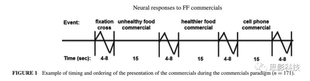 范例中的每個(gè)商業(yè)廣告持續(xù)了大約15秒,并且只顯示了一次。每個(gè)廣告之間是一個(gè)固定的十字交叉(4-8秒)(圖1)。商業(yè)廣告的順序(不健康的快餐,更健康的快餐,手機(jī))被隨機(jī)分配到每一組,4組的順序被隨機(jī)分配到被試身上。