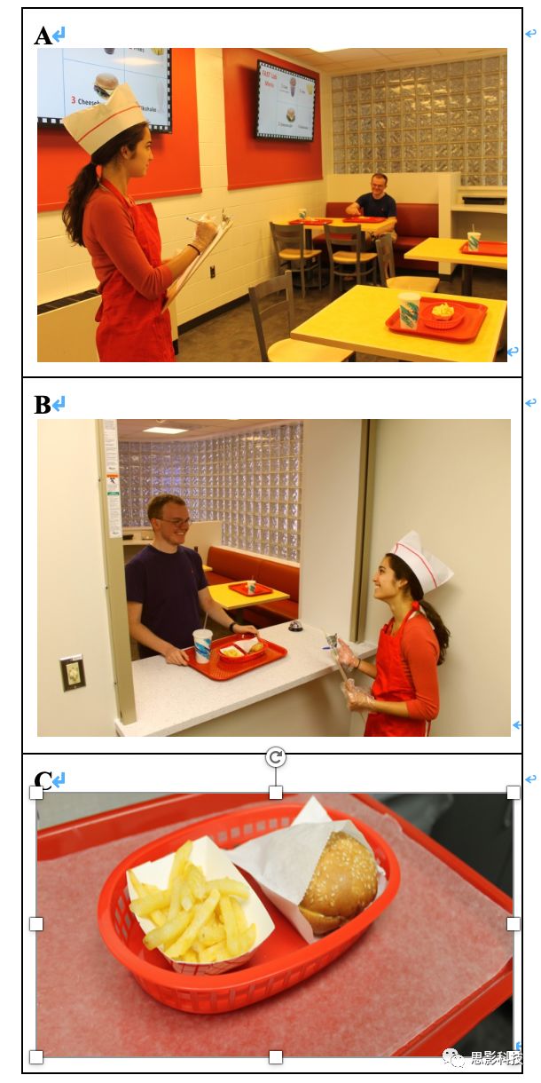 在快餐實(shí)驗(yàn)室掃描后評(píng)估食物攝入量。實(shí)驗(yàn)室被設(shè)計(jì)成模擬快餐餐廳,包括攤位、菜單和食物準(zhǔn)備站。為了提供快餐餐廳的潛在味覺(jué)刺激,在被試進(jìn)入模擬的快餐餐廳之前,他們先做了炸薯?xiàng)l。提供給被試的菜單選項(xiàng)與快餐廣告中的相似:不健康食品(芝士漢堡,炸薯?xiàng)l)和更健康的食物(如烤雞三明治,沙拉)(完整的食物和營(yíng)養(yǎng)信息見(jiàn)補(bǔ)充材料的表2)。被試被告知,他們可以想點(diǎn)多少就點(diǎn)多少,而且有無(wú)限的用餐時(shí)間。在提供食物和飲料之前,以及在被試吃完?yáng)|西之后,食物和飲料的重量要精確到十分之一克。剩下的食物和飲料從最初的重量中減去,以量化消耗量。基于每個(gè)項(xiàng)目的標(biāo)準(zhǔn)營(yíng)養(yǎng)信息用來(lái)計(jì)算消耗的不健康和更健康的食物的能量信息(千卡)。為了評(píng)估被試的總食物攝入量(取決于不健康和健康食物攝入量的總和),作者計(jì)算了不健康和健康食物攝入量(千卡/kilocalories)。