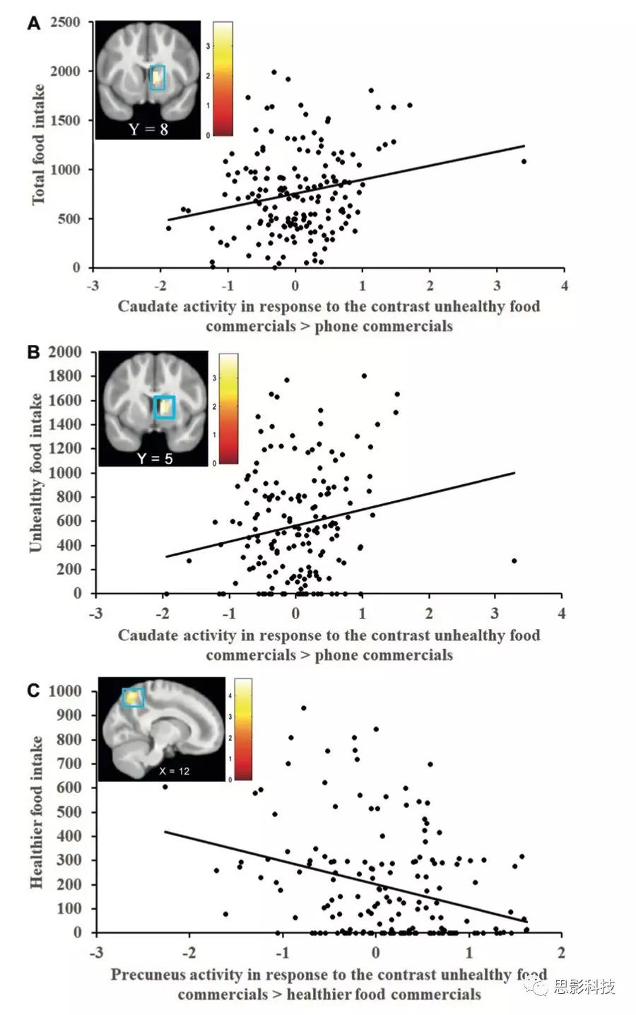 圖2 不健康食物廣告相關(guān)分析結(jié)果注:圖2A是在不健康食物廣告>手機(jī)廣告條件下,尾狀核的激活值能夠顯著預(yù)測(cè)總攝入量,圖2B是在不健康食物廣告>手機(jī)廣告條件下,尾狀核的激活值能顯著預(yù)測(cè)不健康食物攝入量,圖2C是楔前頁(yè)在不健康食物>健康食物的激活值能夠顯著預(yù)測(cè)健康食物的攝入量(負(fù)相關(guān),即不健康食物激活值在這一區(qū)域激活越強(qiáng),健康食物攝入量越少,注意,非因果關(guān)系)