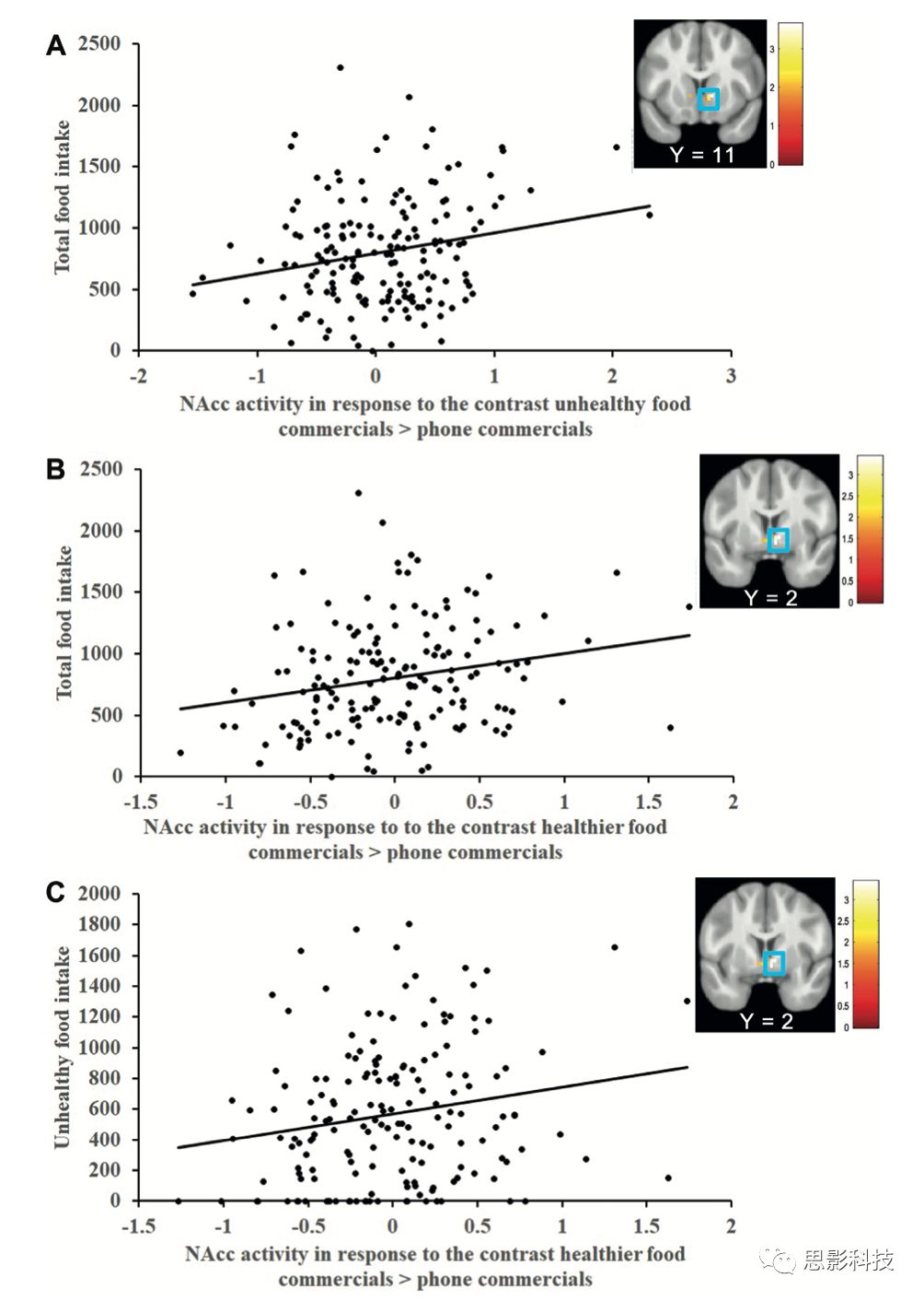 ROI分析發(fā)現(xiàn),不健康的快餐廣告>手機(jī)廣告條件下的右側(cè)NAcc(伏隔核)的BOLD響應(yīng)越高(圖3A;MNI坐標(biāo):12,11,1;Z =3.55;pFWE = 0.003;r = 0.27),被試的食物攝取總量越大。