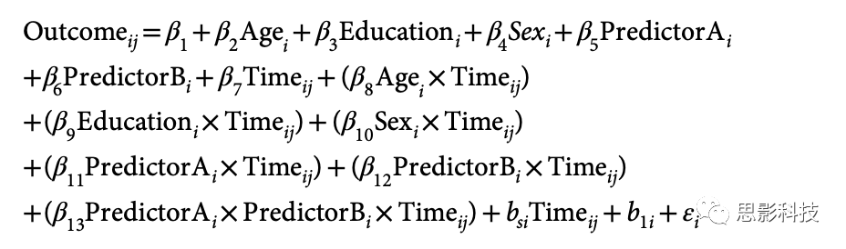 其中Var(εij) =σ2 /tract-sizei, Var (b1i)=τ21,Var (b7i)=τ27,Cov(b1i,b7i) =ρ *τ1*τ7。結果是隨時間測量的結果變量;Agei,Educationi,Sexi指在基線測試期間(i)的age, education or sex;預測因子A/B:感興趣的變量取決于所研究的模型;Timeij是測試階段的時間,相對于基線測試時間;b1i為每個受試者的隨機截距;bsi是每個受試者的隨機斜率;τ21是隨機截距殘差的方差;;和τ26預測隨機斜率殘差的方差。