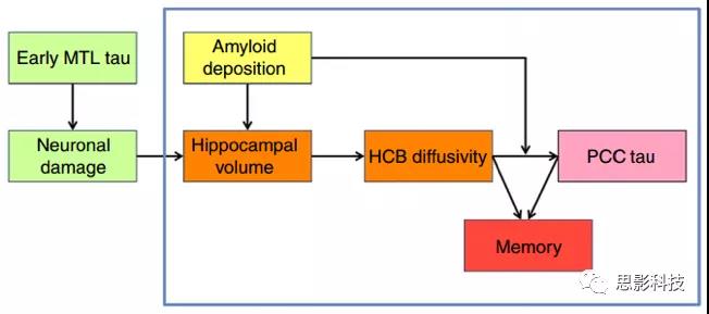 圖四纖維束擴散率、Pcc中tau蛋白的積累、淀粉樣蛋白病理學和記憶表現(xiàn)之間的關系。