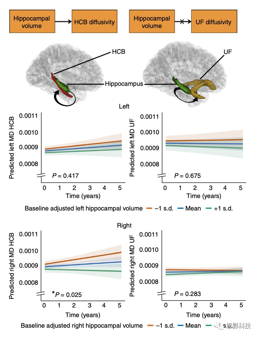 基線時,海馬體積預測HCB擴散率的變化,其方式是:隨著時間的推移,海馬體積越小,白質擴散率越異常(MD、AxD、RD越高)。這些組織只對右側有意義(MD:左:β= 0.0006,t128= 0.82, P = 0.417;右:β= 0.002,t128= 2.26, P = 0.025;386的觀察;圖2和補充圖3)。海馬體積不能預測UF擴散率隨時間的變化(MD:左:β= 0.001,t123= 0.42, P = 0.675;右:β= 0.0005,t123= 1.07, P = 0.283;379的觀察;圖2和補充表2)。在研究海馬體積變化與HCB或UF擴散率變化之間的關系時,也觀察到類似的關系(補充圖4)。右側海馬體積的變化預示了右側HCB MD的改變,在左半腦沒有發(fā)現(xiàn)相關性。(MD:左:β= 0.029,t128= 1.06, P = 0.29;右:β= 0.037,t128= 2.19, P = 0.03;386次的觀察)。海馬體積的變化與UF擴散率的變化無相關性(MD:左:β= 0.041,t123= 0.48, P = 0.63;右:β= 0.004,t123= 0.50, P = 0.62;379次的觀察;補充表2)。