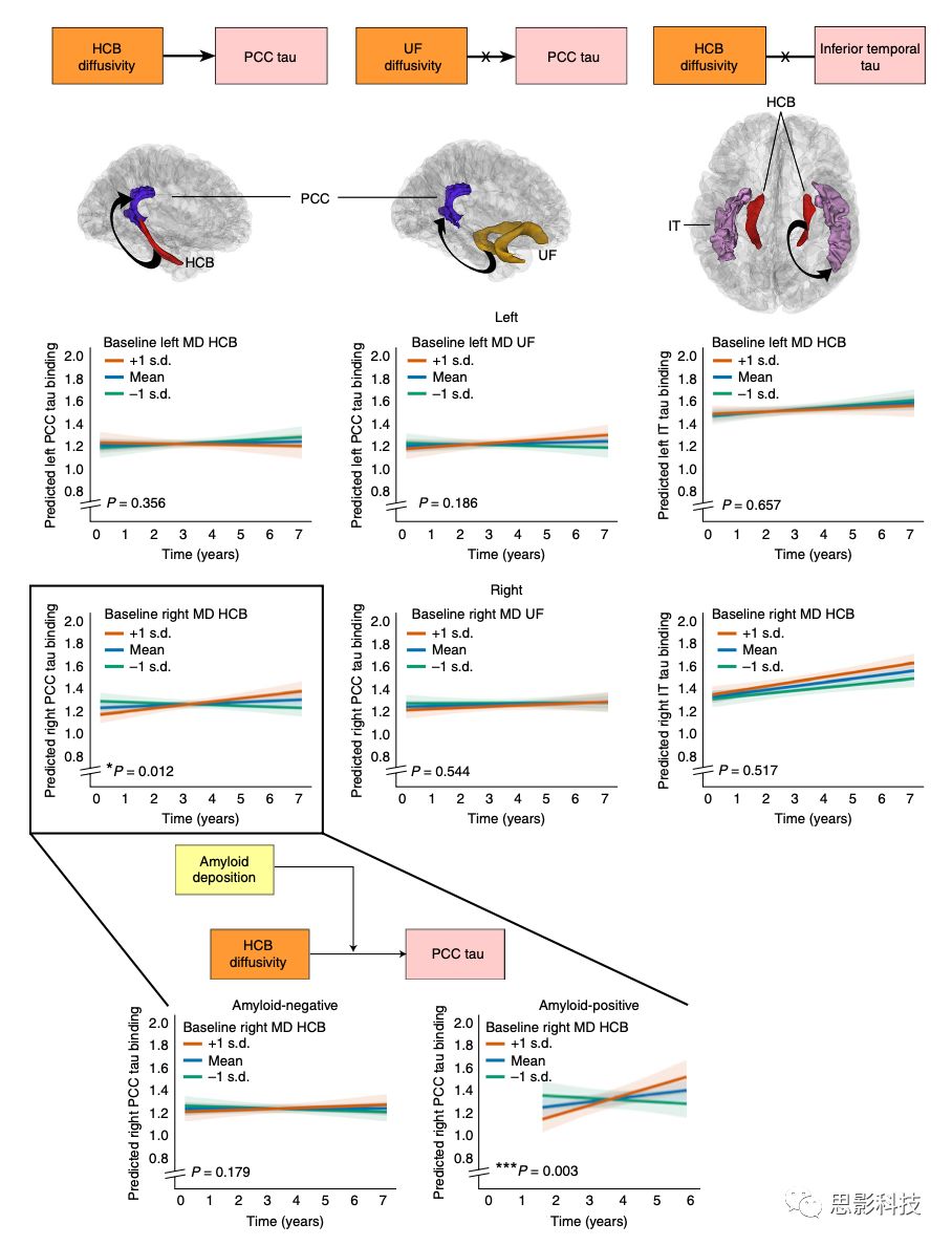 HCB基線處彌散值(MD,AxD,RD)預測右半球PCC tau的年變化,而不是左邊(MD:β= 0.002,t69= 2.55, P = 0.012, 212次觀察),(MD:β= 0.001,t69= 0.93, P = 0.356;圖3和補充表4)。當研究者將基線海馬體積納入模型時,這些效應沒有改變(右側:MD:β= 0.002,t69= 2.47, P = 0.016;左側:MD:β= -0.001,t69= -0.96, P = 0.341)。盡管海馬體積本身不能預測PCC tau隨時間的積累,(右邊:β= 0.00001,t 68= 0.83, P = 0.409;左:β= 0.00001,t68= 0.23, P = 0.821),但這些結果證明HCB擴散率與PCC tau隨時間的積累比海馬更接近。UF 的基線擴散值與PCC tau蛋白的積累無關(右側:MD:β= 0.001,t 68= 0.61, P = 0.544;左:MD:β= 0.001,t68= 1.33, P = 0.186;圖3及補充表4)。