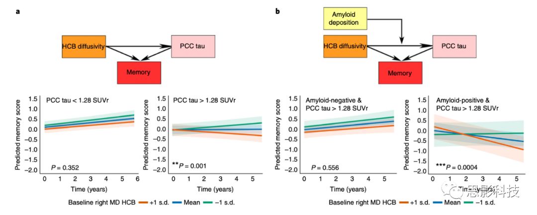 左右HCB擴散率(更低的FA,更高的MD和RD)在基線預測記憶衰退(右側:MD:β= 0.002,t 906= 2.70, P = 0.007;左:MD:β= 0.003,t906= 2.56, P = 0.011;n = 1167),而不是執(zhí)行性能下降(右側:MD:β= 0.0004,t896= 0.55, P = 0.58;左:MD:β= 0.0008,t 896= 0.80, P = 0.42;n = 1,157個觀測值)。三種交互作用(HCB擴散性xPCC tau狀態(tài)x時間)在右側HCB(MD,AxD,RD)的記憶表現(xiàn)是顯著的,而左側不顯著, (右側:MD:β= 0.006,t566= 2.43, P = 0.015;左:MD:β= 0.002,t566= 0.73, P = 0.466;714次觀察,141名參與者;補充表7和補充圖7)。這種交互作用顯示,隨著時間的推移,PCC tau高的被試驅動著右側HCB擴散率和記憶表現(xiàn)之間的聯(lián)系,(高PCC tau(n = 48、248次觀察):MD:β= 0.006,t195= -3.20,P = 0.001;低PCC tau(n= 93, 466次的觀察):MD:β= 0.001,t368= 0.93, P = 0.352;圖4)。為了顯示區(qū)域特異性,研究者進行了另一個三種交互作用,即HCB擴散率x IT tau狀態(tài)x時間在記憶性能的影響,在左右HCB之間沒有發(fā)現(xiàn)顯著的相關性, (右側MD:β= 0.005,t566= 1.44, P = 0.150;左:MD:β= 0.008,t566= 1.17, P = 0.241;714次觀測,n= 141;補充表7)。