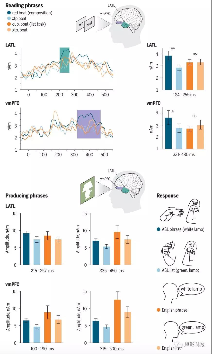 LATL(左前顳葉)和vmPFC(腹內(nèi)側(cè)前額葉)會(huì)參與單一的組合步驟。在理解過(guò)程中,LATL早于vmPFC的參與,但在產(chǎn)出過(guò)程中,兩者是同時(shí)參與的。在產(chǎn)出中,圖片命名范式允許研究不同的語(yǔ)言,同時(shí)完美地控制物理刺激。你可以簡(jiǎn)單地讓參與者用不同的語(yǔ)言說(shuō)出圖片的名字。在這里,類似的LATL和vmPFC效果被發(fā)現(xiàn)在在英語(yǔ)和美國(guó)手語(yǔ)(ASL)的短語(yǔ)規(guī)劃中