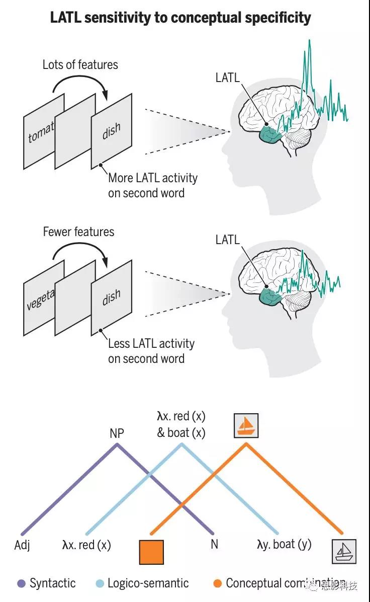 有進(jìn)一步的MEG研究發(fā)現(xiàn),被試在面對(duì)“Indian food”和“Asian food”時(shí),LATL的激活是不一樣的,在面對(duì)印度食物這個(gè)具體的短語(yǔ)義時(shí),LATL的激活是顯著較強(qiáng)的,而在加工亞洲食物時(shí),其激活是比較弱的,我們分析一下會(huì)發(fā)現(xiàn),亞洲食物的語(yǔ)義指向是更模糊的,它可以是日本食物,可以是韓國(guó)食物,也可以是中國(guó)食物,可以是亞洲任何一個(gè)國(guó)家的食物(同時(shí),不同被試平時(shí)接觸的亞洲國(guó)家可能頻率上相差是很大的,很難確定誰(shuí)會(huì)聯(lián)想到哪個(gè)國(guó)家)。這就和圖2中的例子一樣,在tomato dish和vegetable dish中,tomato dish是語(yǔ)義明確的,而vegetable dish則很不明確,產(chǎn)生的激活可以看出,明確語(yǔ)義的tomato dish誘發(fā)了LATL更強(qiáng)的激活。作者測(cè)試了符合句法的短語(yǔ)結(jié)構(gòu)、邏輯語(yǔ)義結(jié)構(gòu)和概念結(jié)構(gòu)的結(jié)構(gòu),發(fā)現(xiàn)了類似的結(jié)果。這說(shuō)明,LATL很可能是對(duì)具體概念敏感,而不是對(duì)句法敏感的。