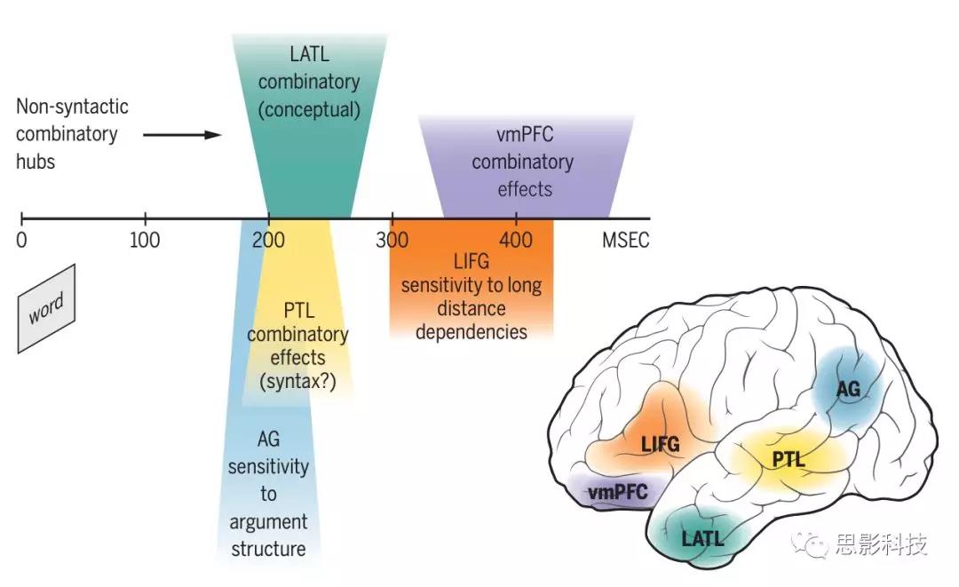 圖3:非句法組合加工的大腦網(wǎng)絡(luò)的時(shí)空特征。時(shí)間軸展現(xiàn)了非句法加工過(guò)程中大腦區(qū)域激活的順序。時(shí)間軸下的區(qū)域代表了句法加工的皮層位置的各種假設(shè)。