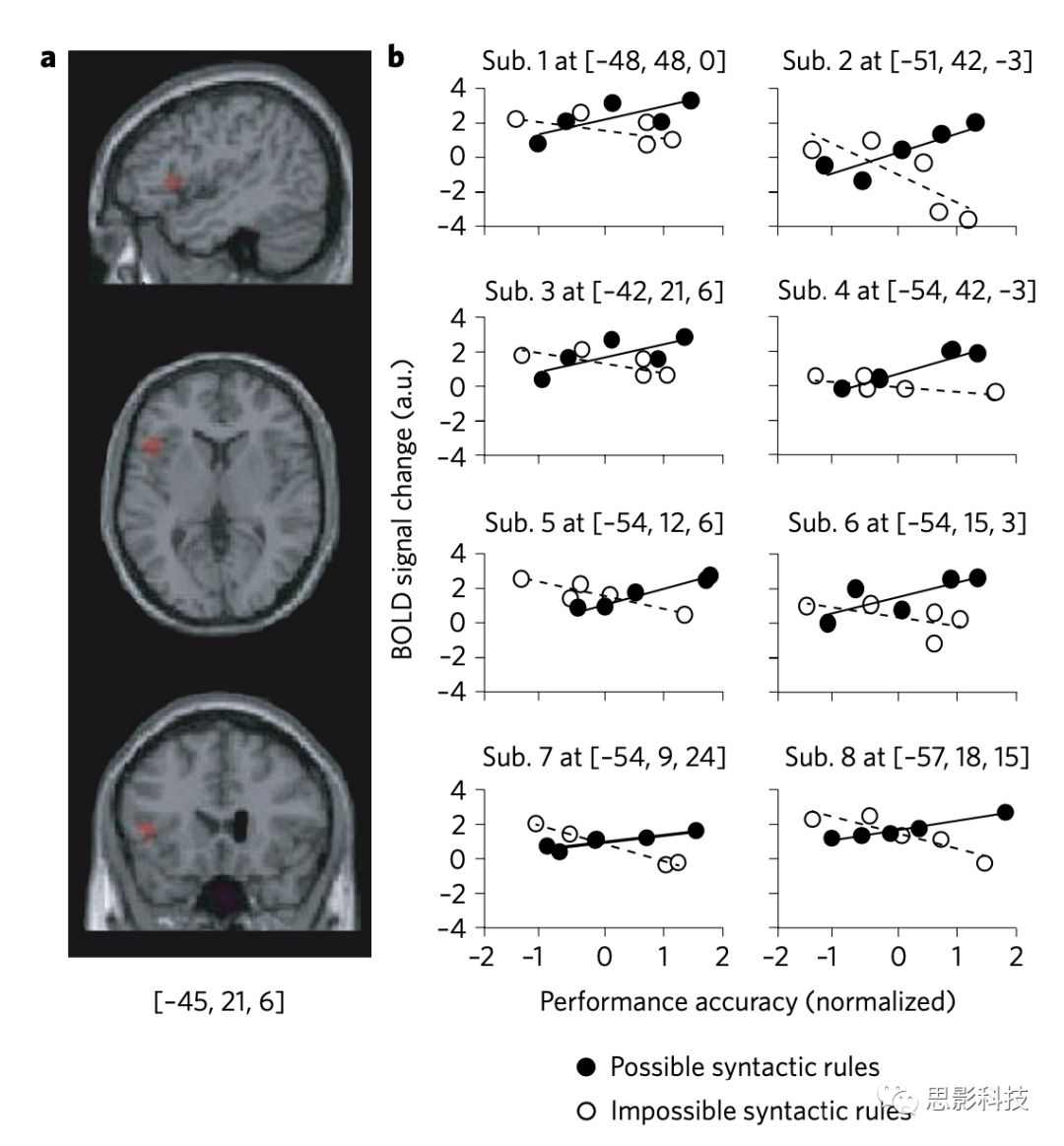 作者進一步指出,布洛卡區(qū)(尤其是它的后部,布洛德曼區(qū)(BA) 44區(qū))在語法學(xué)習(xí)中的作用得到了進一步的支持,因為它研究了一種人工語法的處理過程,這種人工語法模仿生成語法的可能規(guī)則,并使用分配給語法類別的新單詞。顯然,一旦獲得了語法,Broca的區(qū)域就被激活了(仍舊是圖1的那篇研究)。此外,這與語義無關(guān),因為只要處理的結(jié)構(gòu)化序列遵循允許合并操作的UG規(guī)則,那么Broca 區(qū)域就是激活的,而不管它的單詞是真的還是假的。最近的一項腦成像研究為合并計算在人腦中單一應(yīng)用的神經(jīng)基質(zhì)定位提供了證據(jù),例如,由單個合并操作決定的句法結(jié)構(gòu)的形成是一個限定詞短語,由一個限定詞(The)和一個名詞(pish)組成。為了研究與語義無關(guān)的合并計算,可以構(gòu)造一個無語義限定詞短語(pish),研究者發(fā)現(xiàn)對合并操作敏感的神經(jīng)底物定位于BA44的一個非常狹窄的亞區(qū)(圖2a),即BA44最前部的腹側(cè),個體間具有很高的一致性。