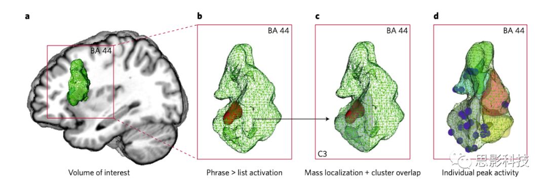 b, BA 44的提取和放大,圖中為激活的平均值,用紅色表示(短語條件與列表條件相比較)。