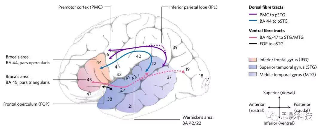 注:左半球與語言相關(guān)的大腦區(qū)域和纖維束的簡圖。背側(cè)纖維束連接顳后皮層和額葉皮層,包括上縱束和弓狀束。終止點不同的有兩條:一條位于背側(cè)前運動皮層(PMC)(紫色束),另一條位于BA44(藍色束)。連接額葉皮層和顳葉皮層的腹側(cè)纖維束也包括兩條流:一條從BA 45到顳、頂葉和枕葉皮層,涉及額枕葉下束(粉紅色束);另一條從額蓋(FOP)到前顳上回(aSTG),涉及鉤突束(深灰色束)。