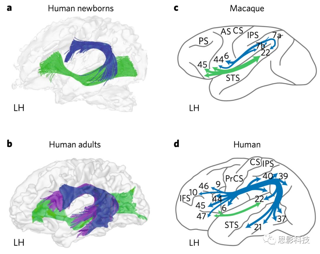 c,d,擴散張量成像數(shù)據(jù)在一個人類大腦的體內(nèi)(d)和一個獼猴大腦死后(c)的示意圖。背側(cè)纖維束,藍色;腹側(cè)纖維束,綠色。在獼猴中,在BA44終止的背側(cè)通路不發(fā)達,而在人類新生兒中,背側(cè)通路尚未髓鞘化,因此功能低下。而在成人中,在BA44終止的背側(cè)通路較強,在彌散張量成像數(shù)據(jù)(b)和解剖數(shù)據(jù)(d)中均可見。只有在成人大腦中,后顳葉皮層和BA44之間的連接才完全發(fā)達。LH,左半球;,弓狀溝;CS,中央溝;額下溝;IPS,即頂下溝;prc文件,中央前溝;