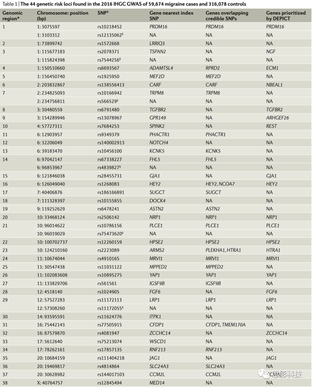 因此,IHGC進(jìn)行第4次GWAS研究并發(fā)表于2016年,數(shù)據(jù)來自59674例患者及316078例對(duì)照。該研究確定了與偏頭痛相關(guān)的38個(gè)基因組區(qū)域包含44個(gè)獨(dú)立的SNPs位點(diǎn)。3個(gè)SNP位點(diǎn)具有全基因顯著性(rs1835740 near MTDH115, rs10915437 near AJAP1 and rs10504861near MMP1)。這些SNP位點(diǎn)是分別通過與偏頭痛各亞型的相關(guān)性確定的(MA、臨床MO或MO及MA)。因此,目前尚需要在同質(zhì)化組內(nèi)最終確定這些位點(diǎn)的穩(wěn)健性。