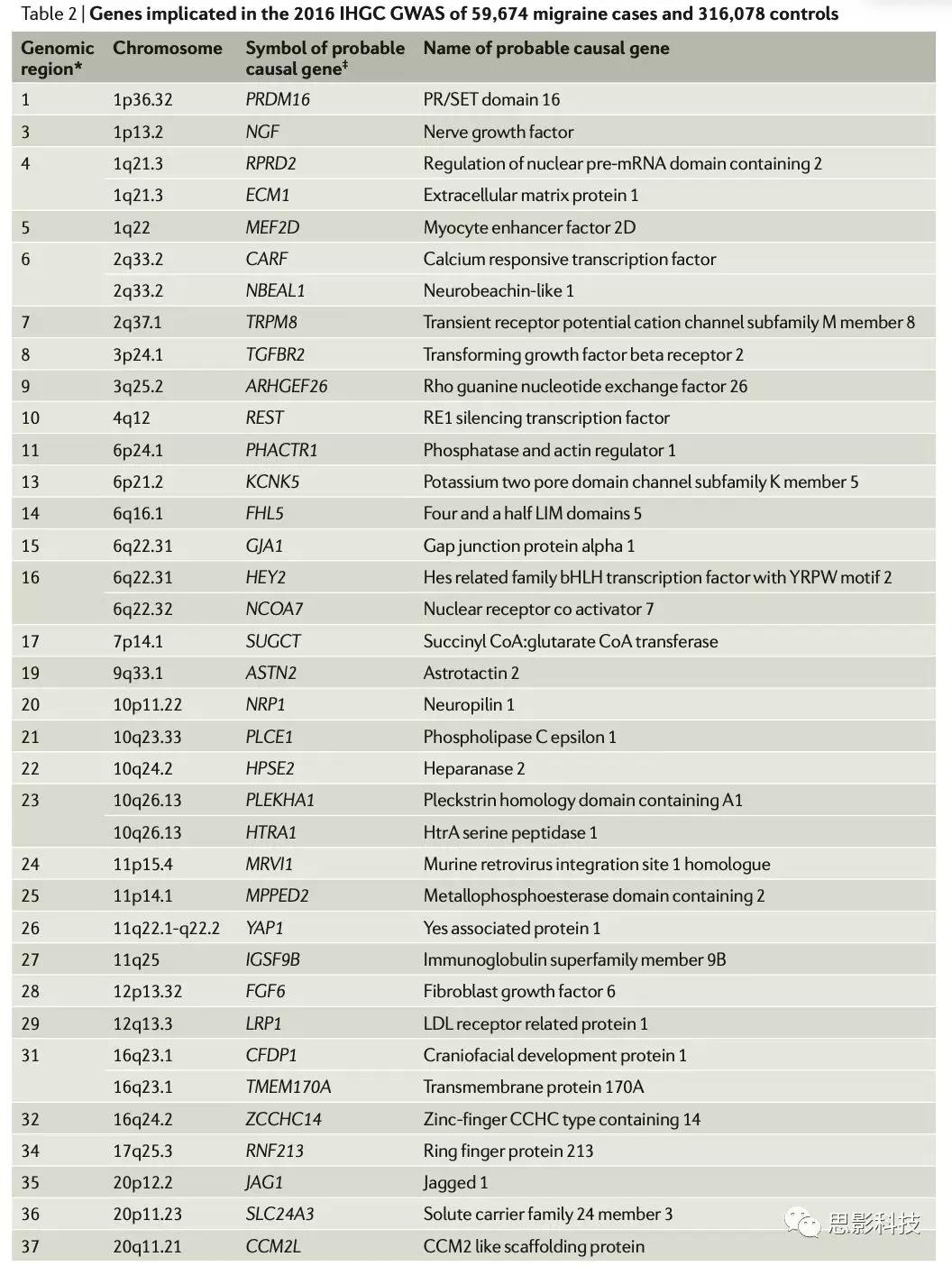 基于人群的研究:2011年IHCGGWAS研究5122例女性偏頭痛患者較18108例女性對(duì)照的基因變異,并確定了7個(gè)SNPs。結(jié)合驗(yàn)證隊(duì)列,得到PRDM16, TRPM8 及LRP1 位點(diǎn)與偏頭痛的相關(guān)性。隨后對(duì)前述3項(xiàng)GWAS研究及其他研究進(jìn)行Meta分析得到12個(gè)與偏頭痛相關(guān)位點(diǎn)。除新發(fā)現(xiàn)的5個(gè)SNP位點(diǎn),對(duì)前述2010年IHCG GWAS研究MA相關(guān)位點(diǎn)得到驗(yàn)證,除rs1835740 SNP(MTDH附近)。