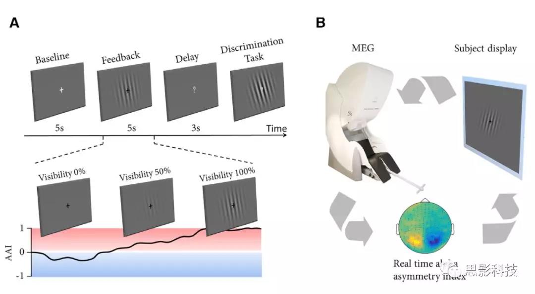 作者使用MEG通過神經反饋來訓練被試控制左頂葉皮層和右頂葉皮層的alpha功率的比例。作者發(fā)現(xiàn),在視覺皮層出現(xiàn)了alpha不對稱分布的現(xiàn)象。alpha訓練導致左右兩個半球的電極上的視覺誘發(fā)電位出現(xiàn)不對稱分布的變化。因此,alpha的減少與感覺處理的增強相關。訓練后的測試顯示,注意在預期方向上存在持續(xù)的偏好。這些結果支持了alpha同步在調節(jié)注意和視覺處理中起因果作用的觀點,alpha訓練可以用來驗證關于同步的假設。
