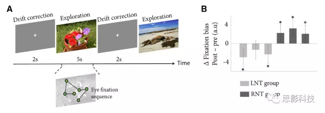 在訓練前和訓練后階段,采用自由觀看任務測量自由觀看行為的水平偏好。作者從自然、城市和形狀分類中選取了120幅圖像。從校正后的彩色圖像數(shù)據(jù)庫中選取自然(50個場景)和城市類別(50個場景)。形狀分類包括來自混雜N-空間網絡(Chaotic N-Space Network)的20幅圖像。為了控制對象分布或顯著特征中可能存在的偏好,所有圖像都被水平鏡像處理,以產生原始和鏡像兩類刺激。每個圖片只呈現(xiàn)給每個被試一次,以其原始或鏡像的形式(在被試之間平衡)。對于每一個被試,在神經反饋階段之前隨機提供60個刺激,其余60個刺激在神經反饋階段之后。圖像按順序呈現(xiàn),如圖5A所示。用Eyellink 1000眼動儀記錄注視路徑。