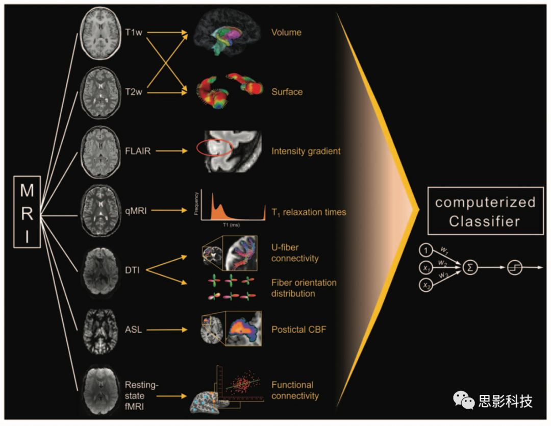 圖2:癲癇影像機(jī)器學(xué)習(xí)流程示意圖。從不同的MRI序列中提取病理形態(tài)學(xué)解剖特征,并將其送入計算機(jī)分類器。這種分析極大地得益于集成從其他診斷模態(tài)提取的特征。