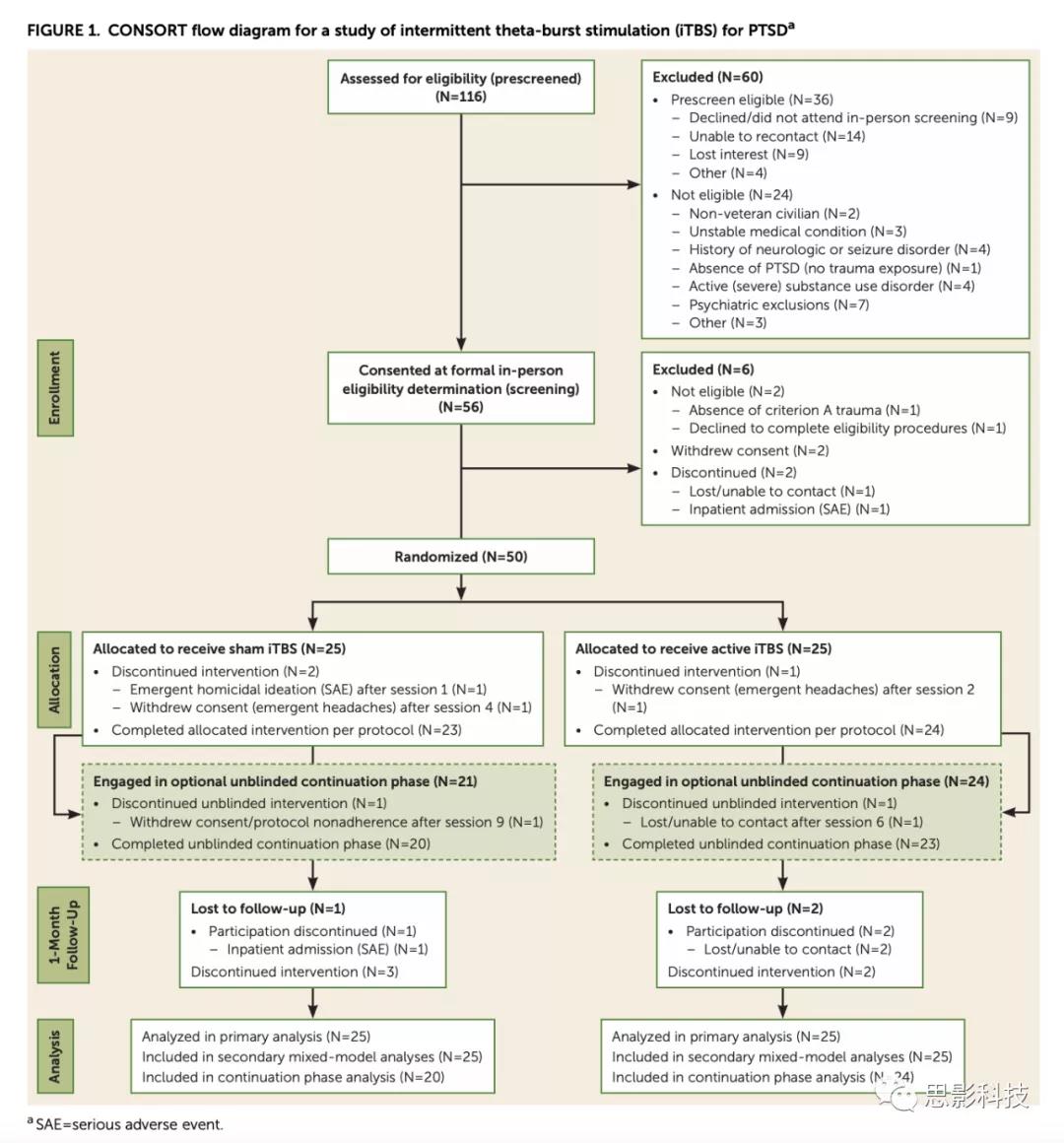 圖1 PTSD的間歇性theta脈沖刺激(intermittent theta-burst stimulation, iTBS)研究的CONSORT流程圖