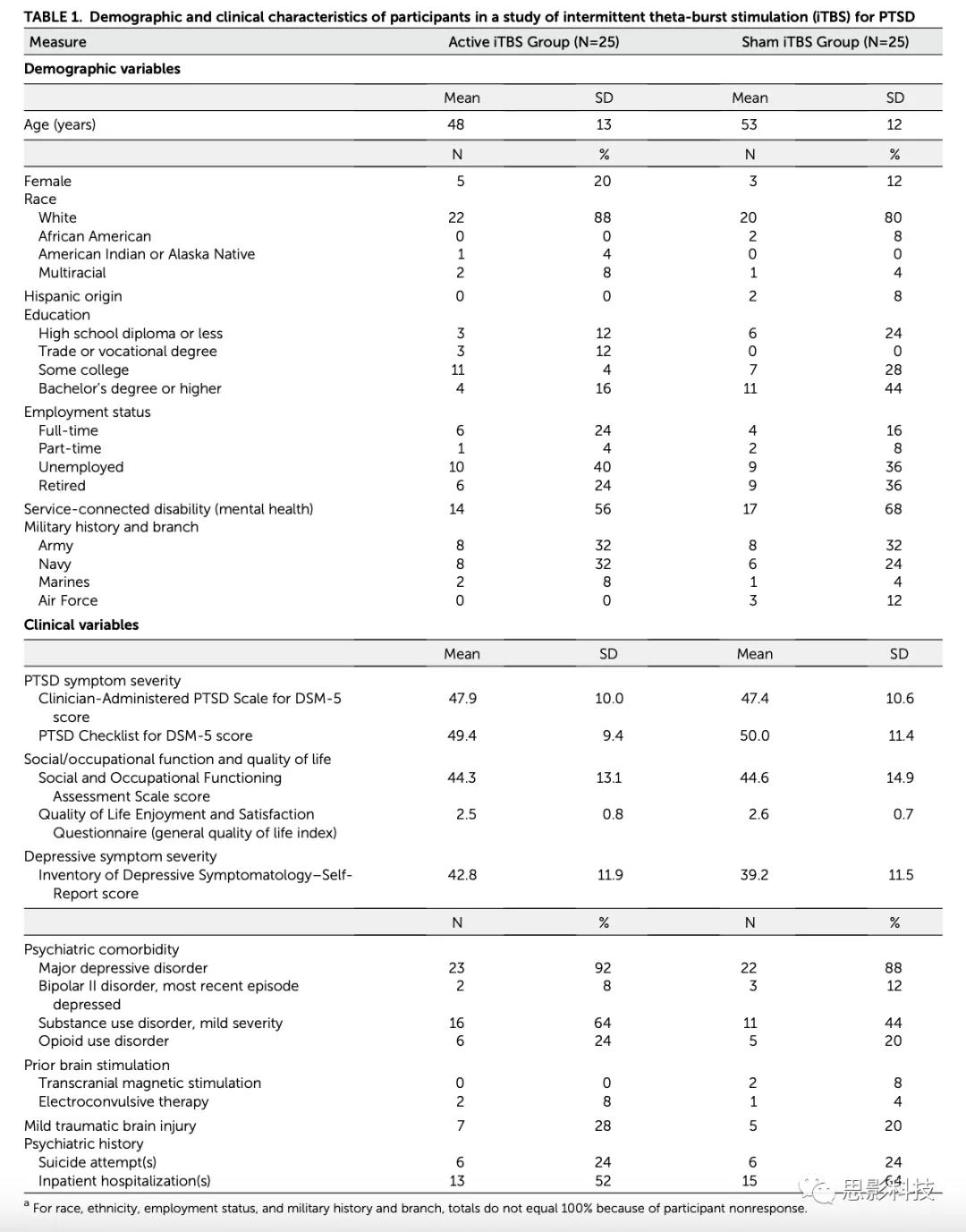 表1 間歇性theta脈沖刺激(intermittent theta-burst stimulation, iTBS)治療PTSD的研究參與者的人口學(xué)和臨床特征