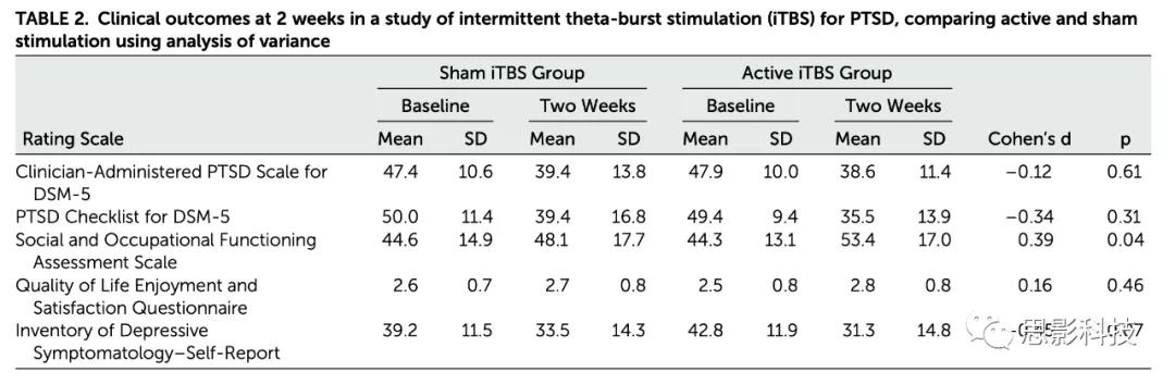 方法:50名PTSD退伍軍人接受10天假刺激對照的iTBS治療(1800個脈沖/天),隨后進(jìn)行10次非盲治療。主要觀察指標(biāo)包括2周結(jié)束時獲得的可接受性(保留率)、PTSD癥狀 (臨床醫(yī)生和自我評估)、生活質(zhì)量、社會和職業(yè)功能以及抑郁變化;方差分析用于比較真刺激和假刺激。在治療1個月后,采用混合模型分析評估次要結(jié)果。對符合條件的參與者子集(N=26)在治療前基線期獲得靜息態(tài)功能MRI,以確定反應(yīng)預(yù)測因子。