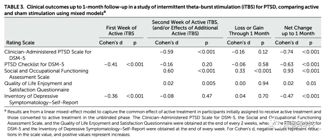 表3 一項(xiàng)關(guān)于間歇性theta脈沖刺激(intermittent theta-burst stimulation, iTBS)治療PTSD的研究,使用混合模型比較了真假刺激組隨訪至1個月的臨床結(jié)果