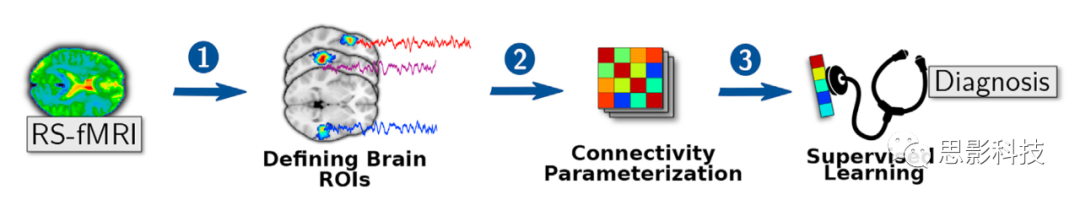 功能連接能否轉(zhuǎn)化為預(yù)測(cè)感興趣表型的生物標(biāo)記與機(jī)器學(xué)習(xí)管道(管道在本文中的意思是連續(xù)的數(shù)據(jù)處理形成的固定步驟)息息相關(guān),換句話(huà)說(shuō),機(jī)器學(xué)習(xí)管道對(duì)此過(guò)程有著關(guān)鍵作用。就REST-fMRI數(shù)據(jù)而言,將功能連接轉(zhuǎn)換為對(duì)分類(lèi)對(duì)象的表型的處理管道通常包括3個(gè),如圖1所示: