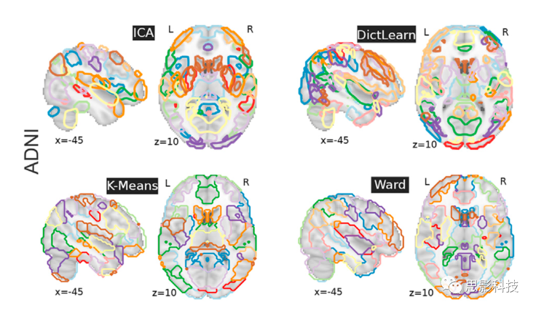 本文選擇了四種當(dāng)下流行的數(shù)據(jù)驅(qū)動(dòng)方法(從fMRI數(shù)據(jù)中提取ROI,且用兩種聚類(lèi)方法來(lái)定義ROI:)(1)K均值聚類(lèi)(2)Wards聚類(lèi)算法(3)組ICA方法(4)字典學(xué)習(xí)方法