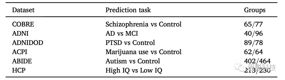 表1:數(shù)據(jù)集和預(yù)測(cè)任務(wù)。每組的被試數(shù)目:COBRE :142人ADNI :136 人ADNIDOD:167人ACPI :126 人ABIDE :866人HCP : 443人