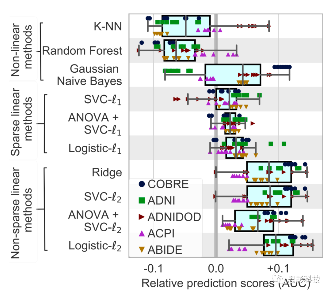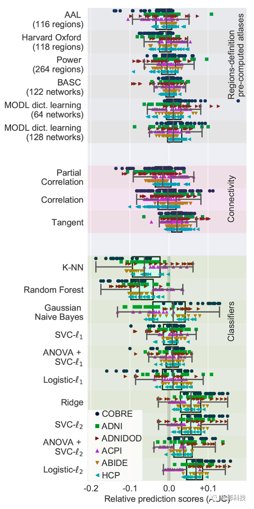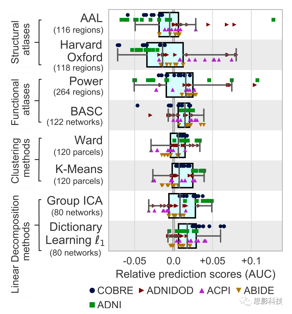 該圖展示了相對(duì)預(yù)測(cè)分?jǐn)?shù)的邊際分布情況,最佳選擇方法正向排序?yàn)椋?/span>基于字典學(xué)習(xí)的分區(qū)方法(MOD1)、聚類(lèi)法(BASC)、連通性的切數(shù)空間參數(shù)化方法以及L2正則化的邏輯回歸方法。