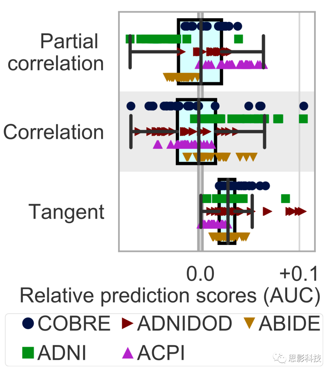 圖4總結(jié)了REST-fMRI數(shù)據(jù)集的相對(duì)預(yù)測(cè)分?jǐn)?shù)受協(xié)方差矩陣的參數(shù)化情況的影響。通常來(lái)說(shuō),切空間參數(shù)化(正切空間投影法被應(yīng)用于功能連接的估計(jì),具體方法可以看這篇文章:https://www.ncbi.nlm.nih.gov/pmc/articles/PMC7086233/)的性能優(yōu)于完全相關(guān)或部分相關(guān)。