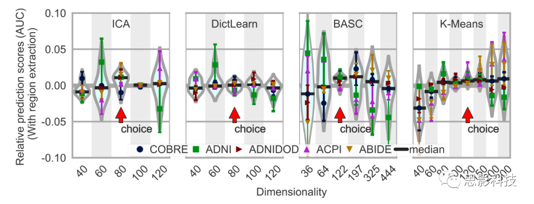 圖6:腦區(qū)數(shù)量對(duì)預(yù)測(cè)準(zhǔn)確性的影響。該圖顯示了不同方法(對(duì)五個(gè) rest-fMRI 數(shù)據(jù)集采用的方法)的 AUC 分?jǐn)?shù)的分布情況。水平條(黑色)表示中位數(shù),紅色箭頭表示維度。