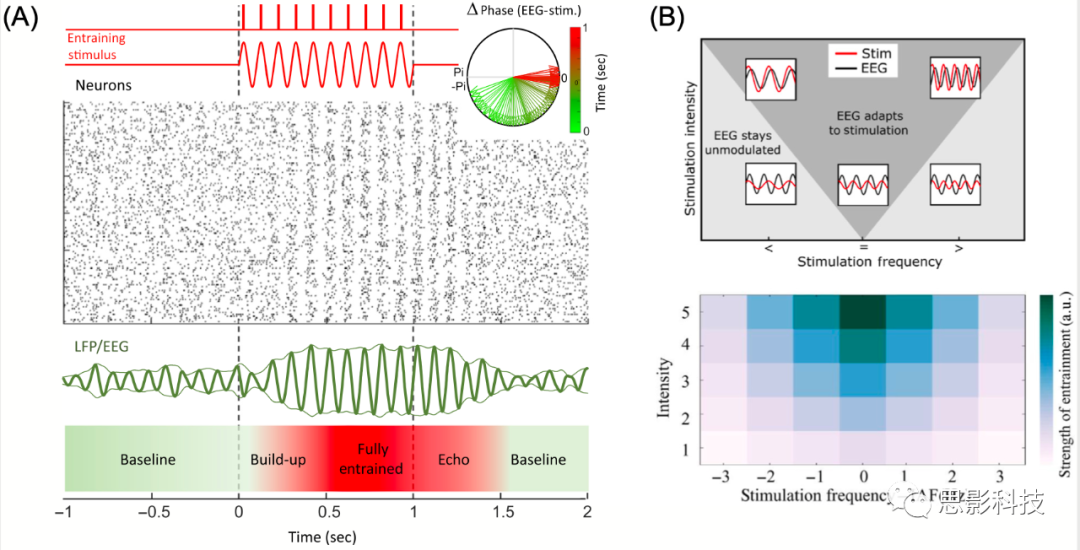 (A)神經(jīng)元群通過(guò)連續(xù)刺激(正弦波)或脈沖刺激夾帶。柵格圖顯示了神經(jīng)群的模擬峰值活動(dòng),局部場(chǎng)電位(local field potential, LFP)/腦電圖(electroencephalography, EEG)顯示了群體水平的活動(dòng)。右上方顯示了夾帶刺激和神經(jīng)元群活動(dòng)之間的相位差異,顏色表示從夾帶開(kāi)始(綠色)到結(jié)束(紅色)的時(shí)間。