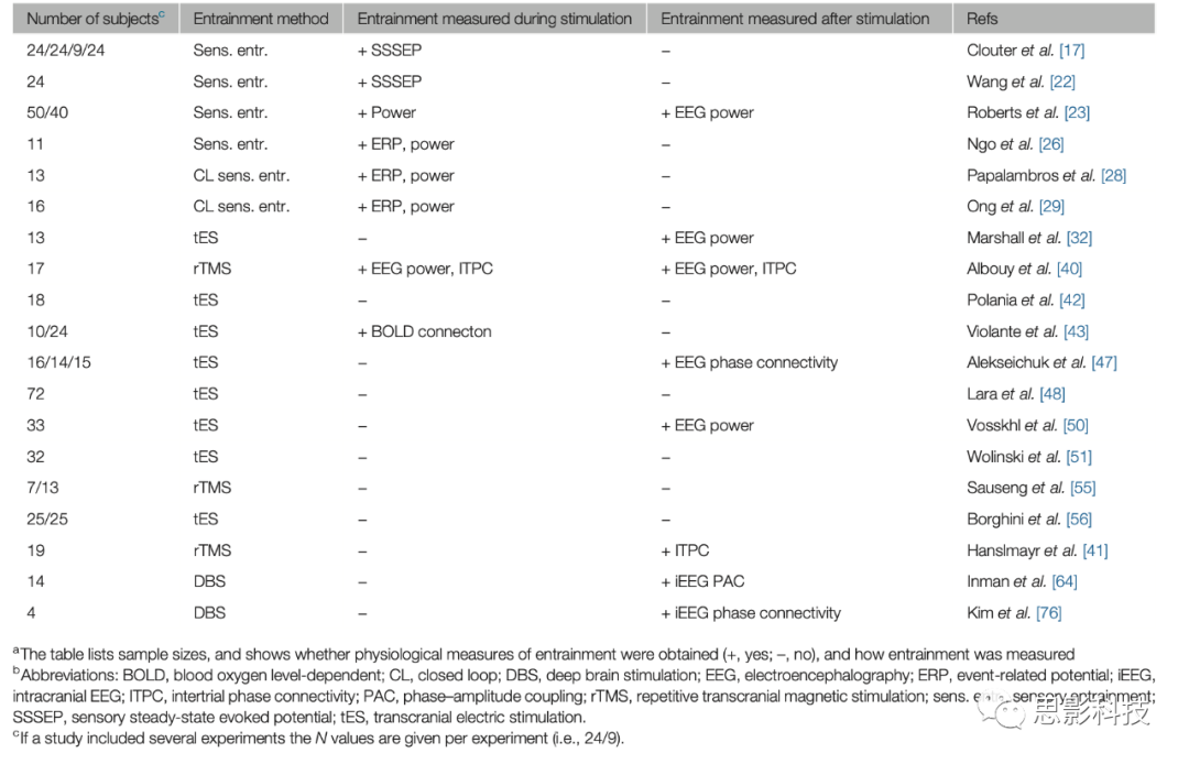 記憶振蕩的因果作用可以通過(guò)調(diào)節(jié)振蕩的實(shí)驗(yàn)來(lái)測(cè)試,并評(píng)估這種調(diào)節(jié)是否對(duì)記憶的行為測(cè)量有影響。振蕩的調(diào)制可以通過(guò)夾帶實(shí)現(xiàn)(框1)。夾帶改變了自然發(fā)生的振蕩,從而探索自然生理發(fā)生狀態(tài)的因果相關(guān)性。不要將這種方法與誘發(fā)非典型節(jié)律性活動(dòng)的方法混淆,換言之,這種活動(dòng)不是在受刺激區(qū)域自然存在的(如電休克療法),這也可能產(chǎn)生認(rèn)知后果,更有可能以損害的形式出現(xiàn),或?qū)Ω信d趣的記憶行為產(chǎn)生微不足道的影響。在人類(lèi)大腦中,振蕩可以通過(guò)三種不同的刺激方法進(jìn)行廣泛的夾帶:(i)感覺(jué)夾帶,(ii)無(wú)創(chuàng)電/磁夾帶,(iii)有創(chuàng)電夾帶。這些夾帶方法越來(lái)越多地用于基礎(chǔ)神經(jīng)科學(xué)研究,以提出關(guān)于振蕩和記憶的機(jī)制作用的具體問(wèn)題,以及旨在改善健康和非健康大腦記憶功能的應(yīng)用研究。在接下來(lái)的研究中,我們回顧了這些結(jié)果,重點(diǎn)關(guān)注了在工作記憶(working memory, WM)和情景記憶任務(wù)中夾帶對(duì)記憶表現(xiàn)的可能影響。由于對(duì)記憶的特別關(guān)注,本綜述與以前的一些綜述有所不同。正如后面詳細(xì)討論的,在這種情況下,對(duì)樣本大小的考慮是一個(gè)重要的主題,表1列出了本文討論的關(guān)鍵研究的概述,以及它們各自的樣本大小。
