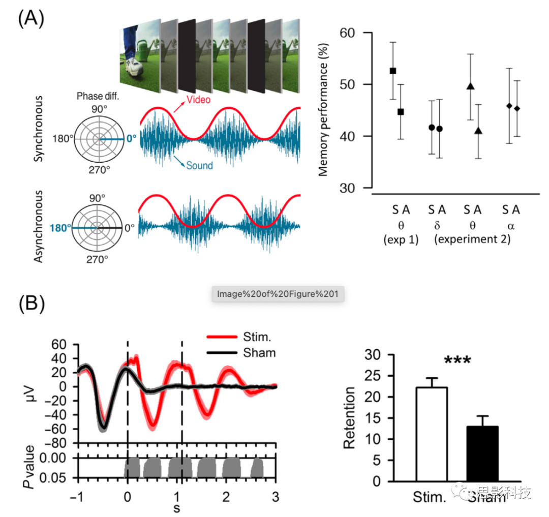 (A) 視聽(tīng)視頻片段播放3秒。視頻(紅色)和音頻(藍(lán)色)分別在theta (4 Hz)頻率正弦波下進(jìn)行亮度/振幅解調(diào)。在記憶編碼階段,視頻和聲音被調(diào)制,使相應(yīng)的大腦區(qū)域要么是同相的(同步條件),要么是不同相的(異步條件)。與異步刺激(A)相比,同步刺激(S)的聯(lián)想記憶回憶(右圖)更好。這種效應(yīng)是特定于theta (4 Hz)的,使用較慢(delta, 1.6 Hz)或較快(alpha, 10.4 Hz)的夾帶頻率無(wú)法獲得。